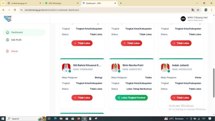 Batang Hari - MAN 3 Batang Hari kembali menorehkan prestasi membanggakan. Salah satu siswinya, Ririn Novita Putri, berhasil lolos ke tingkat provinsi pada ajang Olimpiade Madrasah Indonesia (OMI) 2025. Keberhasilan ini menjadi bukti nyata bahwa semangat belajar dan kerja keras peserta didik madrasah mampu bersaing di tingkat yang lebih tinggi.