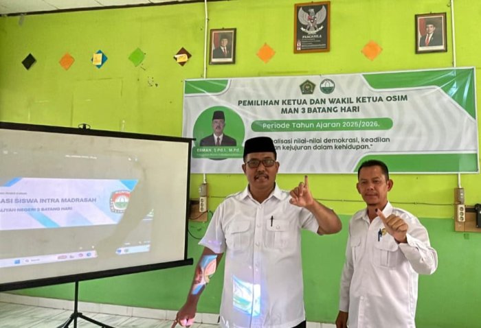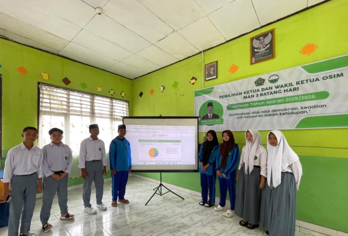 Batang Hari - Pemilihan umum Organisasi Siswa Intra Madrasah (OSIM) di MAN 3 Batang Hari untuk pertama kalinya dilaksanakan secara online. Kegiatan ini menjadi sejarah baru di lingkungan madrasah karena seluruh siswa dan guru dapat berpartisipasi secara digital dalam menentukan calon pemimpin organisasi siswa. Sistem pemilu online ini dinilai lebih efektif, transparan, dan sesuai perkembangan zaman.