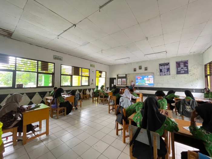 Salah satu contoh penerapan penginderaan jauh yang dibahas adalah penggunaannya dalam mendeteksi bencana alam, seperti banjir dan kebakaran hutan. Peserta didik terlihat antusias mengikuti penjelasan guru karena materi ini dikaitkan langsung dengan kondisi lingkungan di sekitar mereka. Hal ini membantu siswa memahami peran penting teknologi geospasial dalam kehidupan sehari-hari.