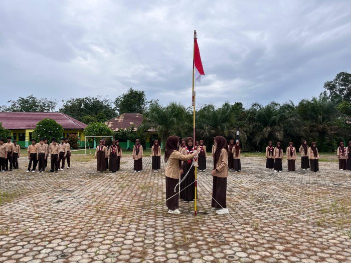 Sebagai Pradana Dimas Wiranata memimpin jalannya kegiatan dengan tegas dan penuh tanggung jawab. Sementara itu, pengibaran bendera Pramuka dilakukan dengan khidmat oleh Dinda, Raisa, dan Ririn. Prosesi ini menjadi momen penuh makna, menggugah semangat kebangsaan dan rasa cinta terhadap gerakan Pramuka.