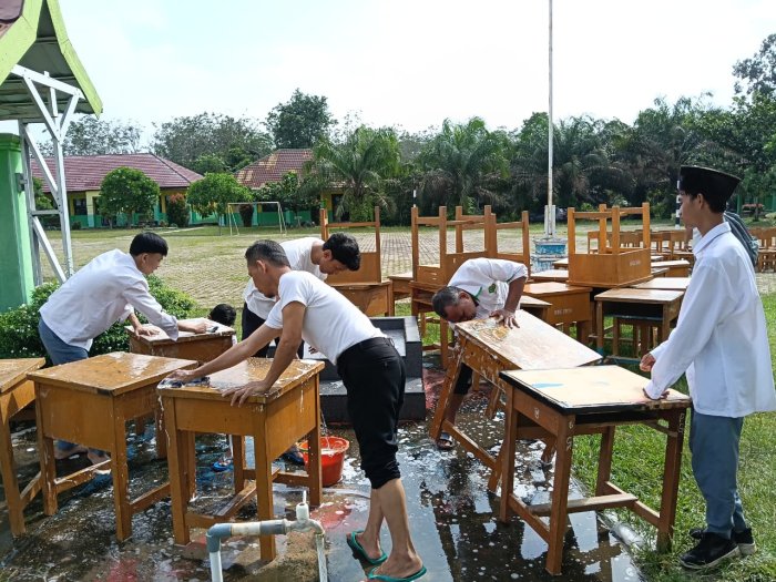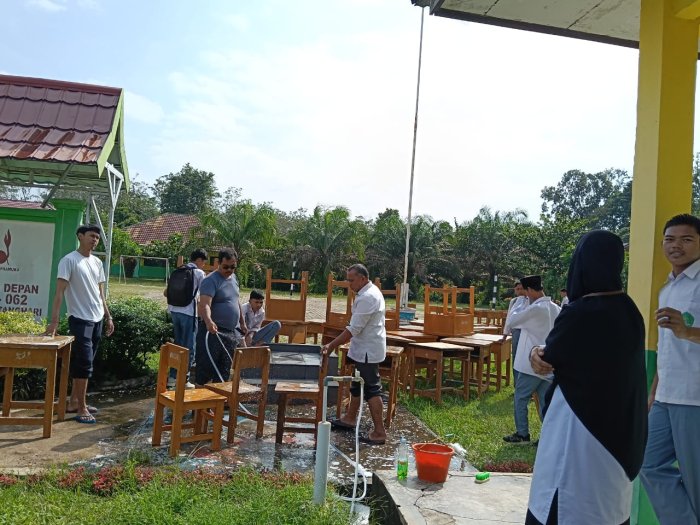 Sebagai bentuk dedikasi, Pak Erman terlihat ikut mencuci bangku dan meja belajar bersama murid. Dengan penuh semangat, beliau membersihkan fasilitas kelas tanpa ragu, menunjukkan bahwa tanggung jawab menjaga kebersihan merupakan tugas bersama, tanpa memandang jabatan atau posisi.